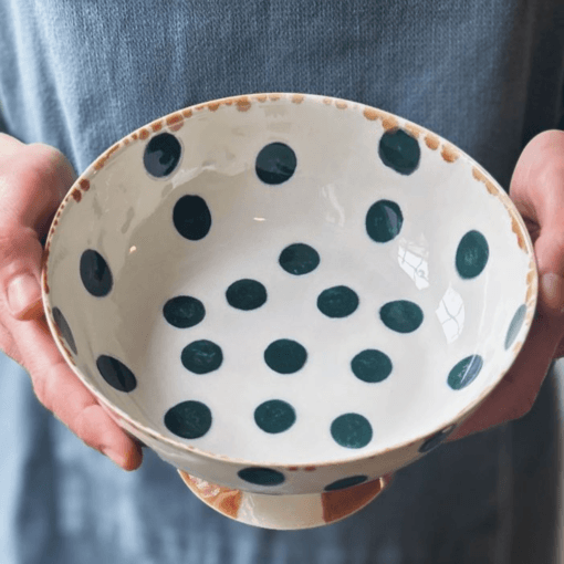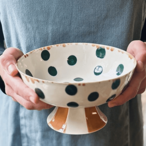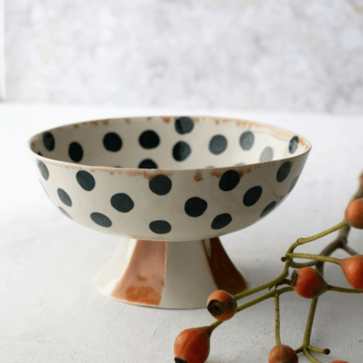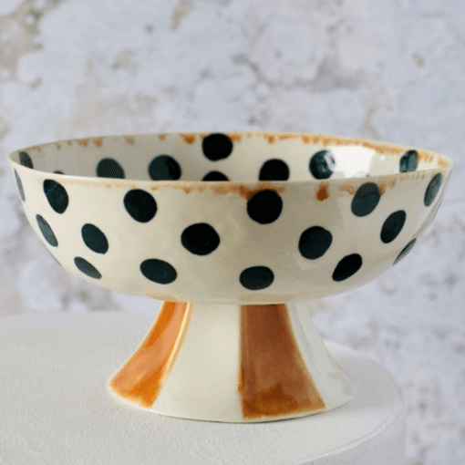 Discover the magic of craftsmanship with our Dots & Stripes Medium Footed Bowl, a masterpiece in the realm of serve wares.
