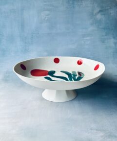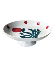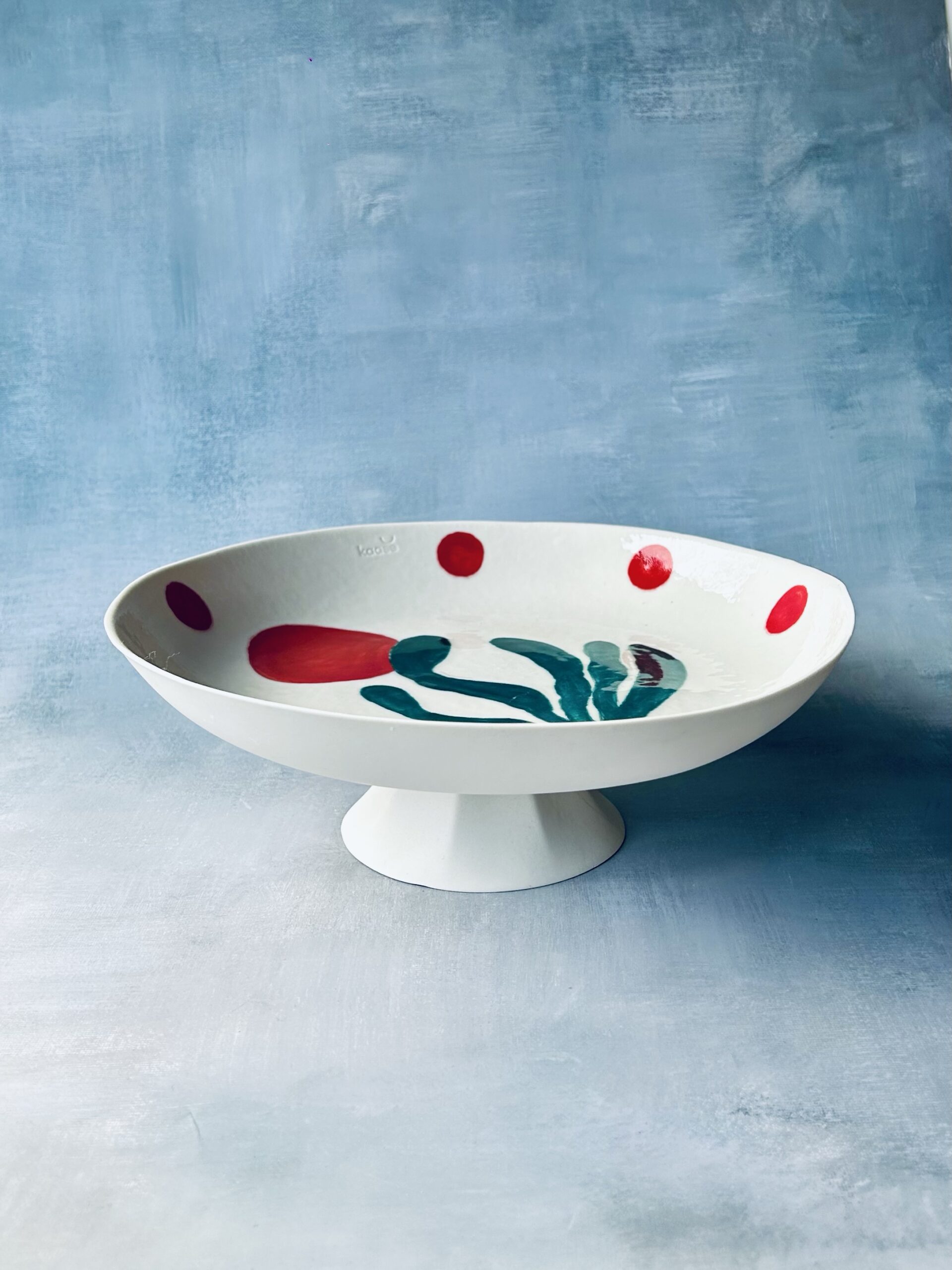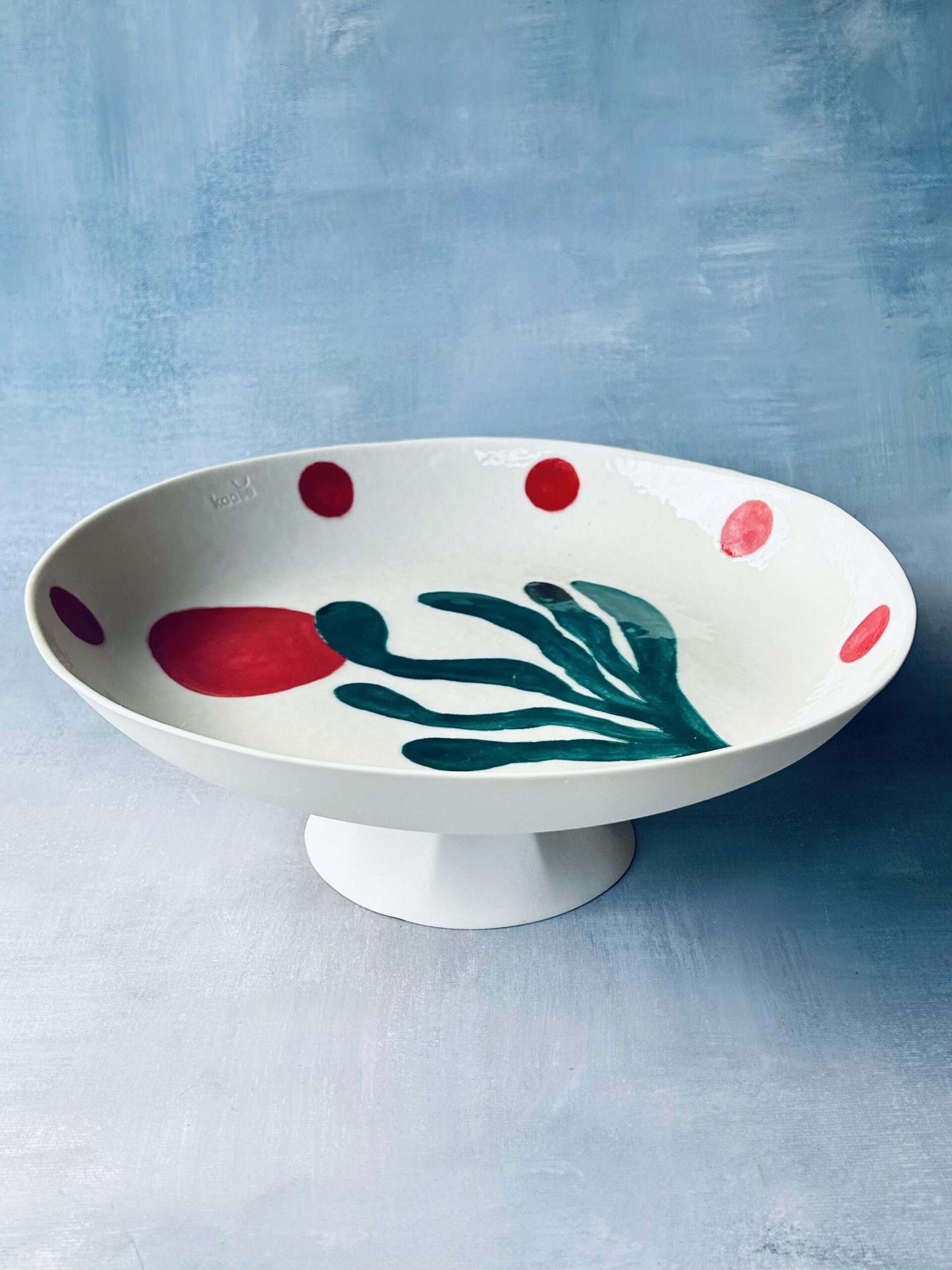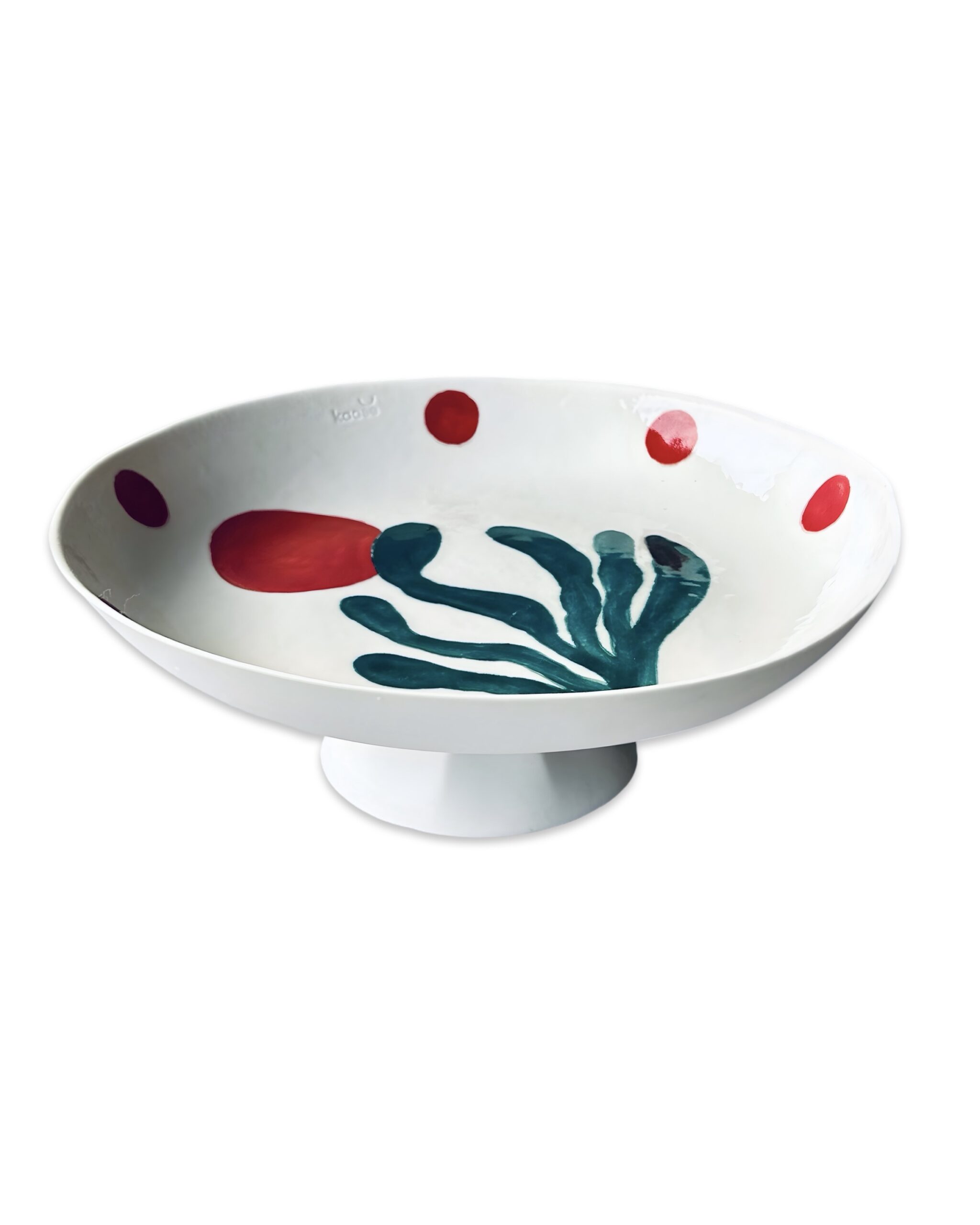 A handmade footed serving bowl with coral reef artwork. Hand-painted Limoges porcelain with elevated pedestal base. Perfect for serving or as decorative display.