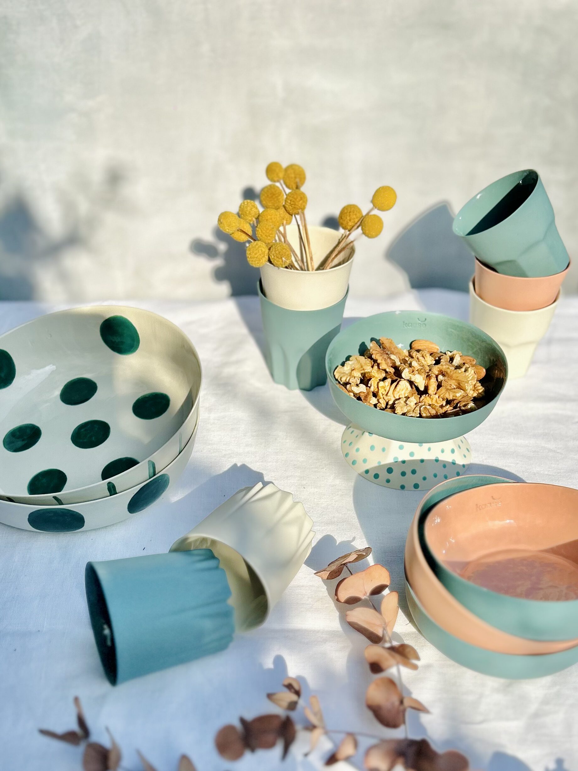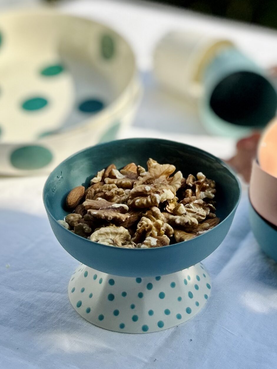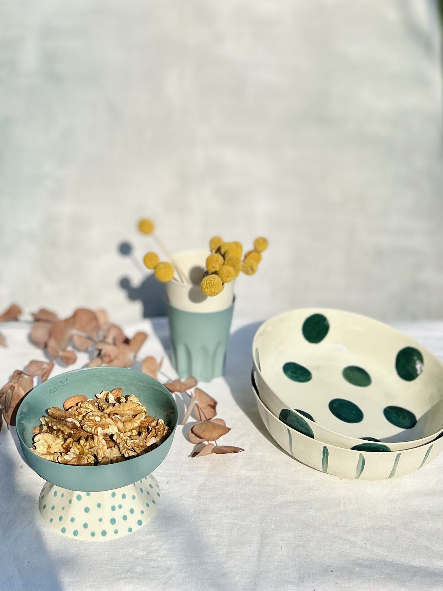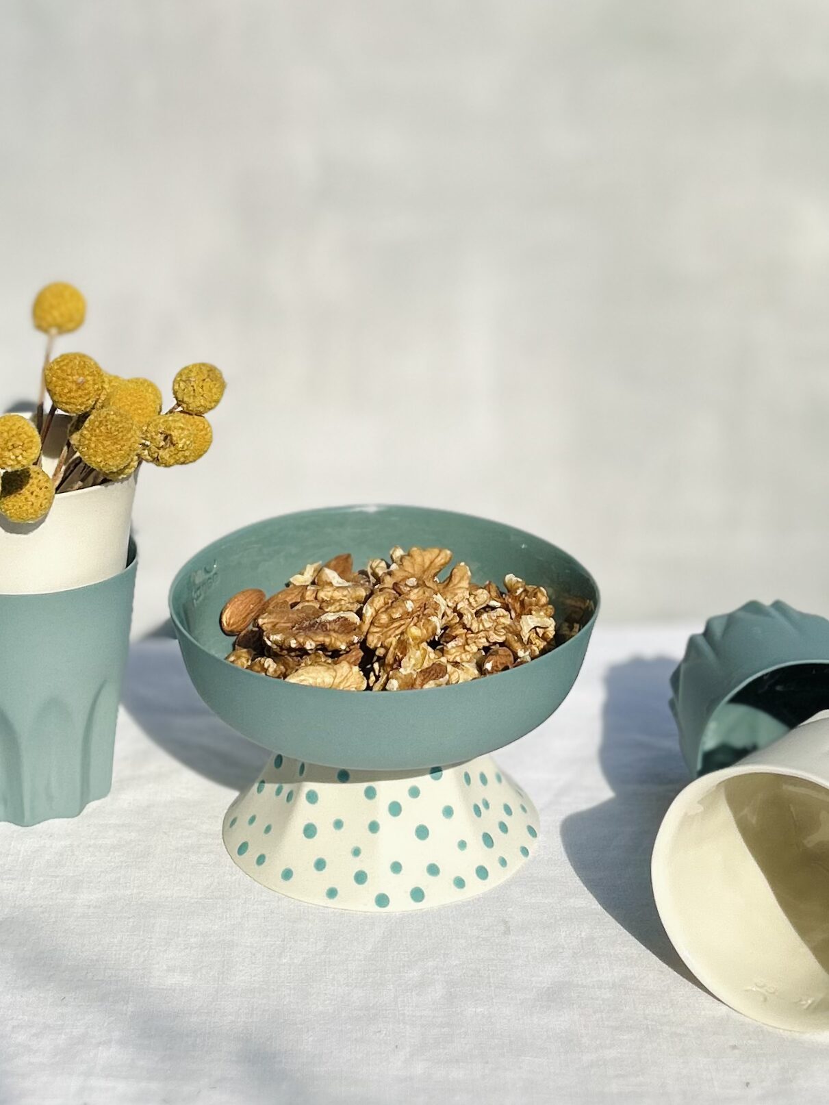 A porcelain footed serving bowl from the Macaron Collection. Handmade Limoges porcelain with delicate translucent walls. Perfect for snacks, salads and decorative display.